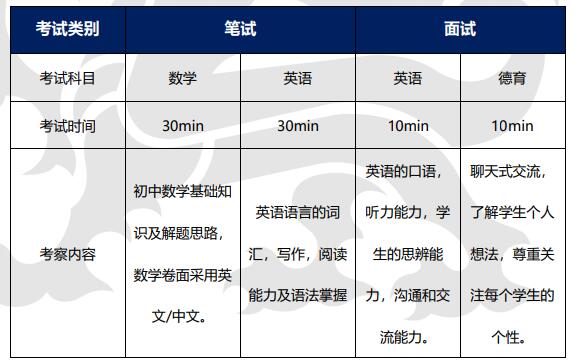 入学考试分为笔试(英语,数学)、面试(英语和德育综合)两部分。
