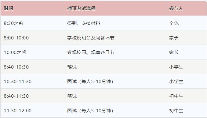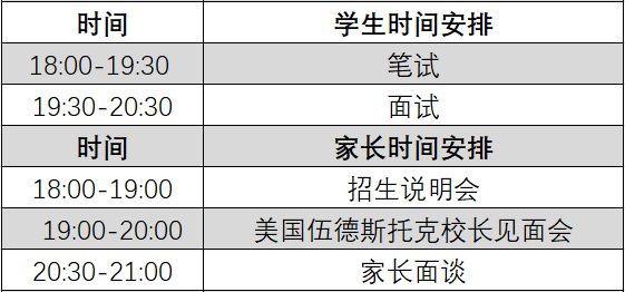 1)笔试:英语、数学,共1.5小时 2)面谈:5-10分钟(学生、家长分别面谈)