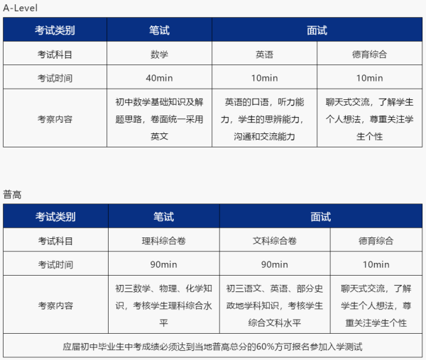 高中双学历A-level班:除A-level入学测试外,学生必须参加中考并取得中考成绩及初中毕业证书