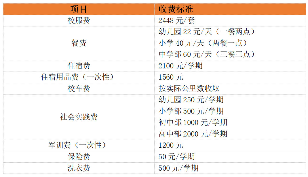 校服费、餐费、住宿费、住宿用品费(一次性)、校车费、社会实践费、军训费、保险费等代收代办费和服务性收费如下: