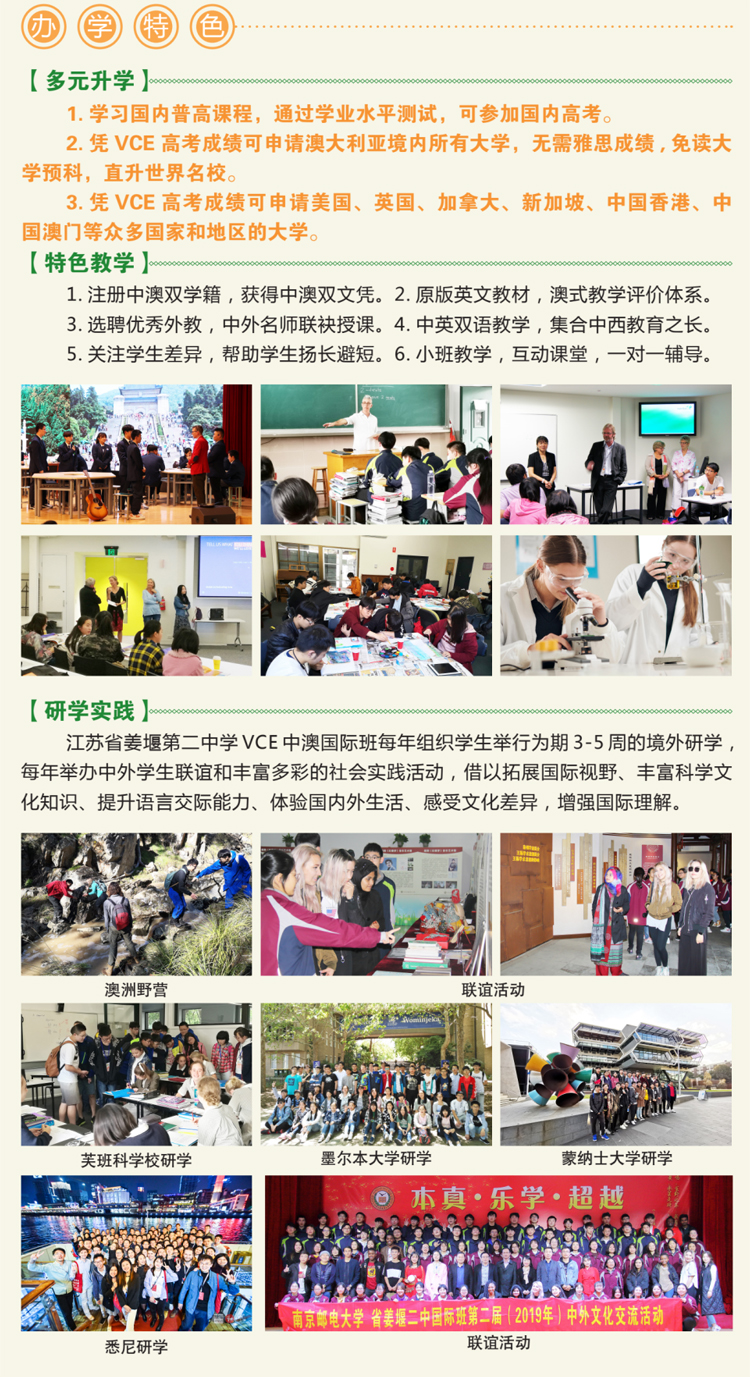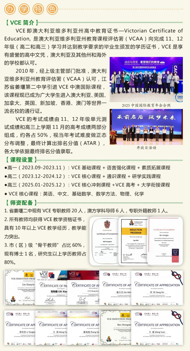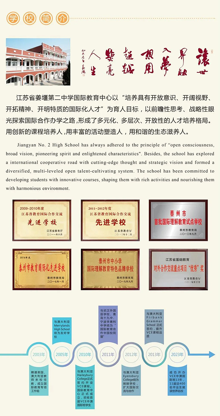 江苏省姜堰第二中学自2010年在泰州地区首创VCE中澳国际班以来,成就斐然,迄今已有11届(近400名)毕业生 100%获得澳洲高中教育证书(VCE证书),全部直接升入澳大利亚、美国、英国、新加坡等。国家和中国香港、澳门等地区优秀大学本科就读,创造出了县域普通高中中外合作办学令人惊叹的优异业绩。连续 11届学生澳大利亚八大名校录取率 80%以上,世界排名前 50、100和200名大学平均录取率分别高达67.7%、82.8.%和93.9%,连续11年优秀率蝉联VCE中国区第一。