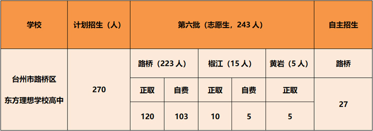 自主招生:面向路桥区招生,有意向者可提前与学校招生办老师联系并做好报名意向登记。中考成绩公布后,考生须在第一时间凭中考成绩到我校招生办咨询与报名。
