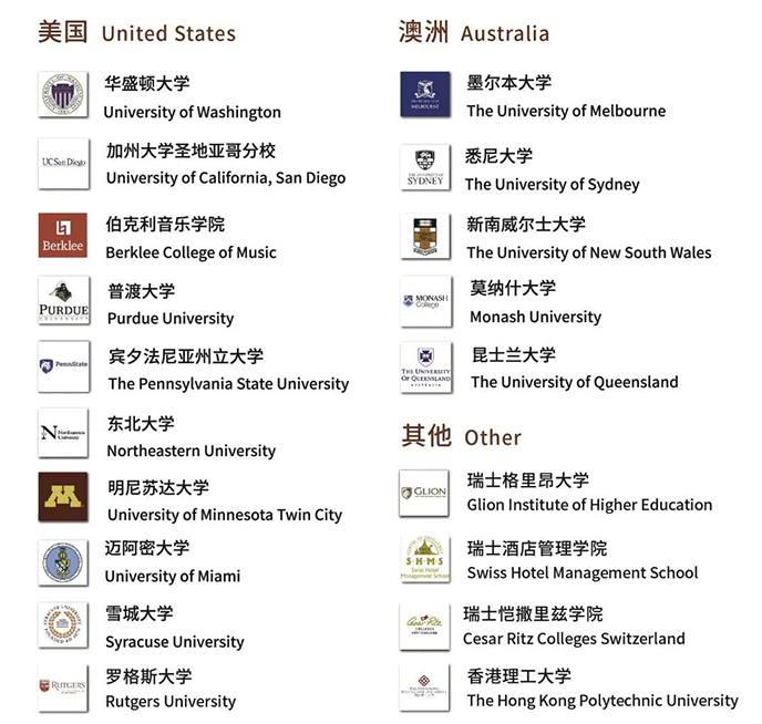 往届国际课程毕业生57%升入世界排名前30的大学,80% 升入世界排名前100的大学,包含加拿大的多伦多大学、UBC、滑铁卢大学,英国的帝国理工、UCL、爱丁堡、曼彻斯特、KCL、伦艺,美国的华盛顿大学、伊利诺伊大学香槟分校、普渡大学、明尼苏达大学双城分校、宾州州立大学、雪城大学、加州大学圣地亚哥分校、迈阿密大学、伯克利音乐学院,澳大利亚的悉尼、墨尔本、莫纳什大学,瑞士格里昂、恺撒里兹学院以及香港理工大学等。