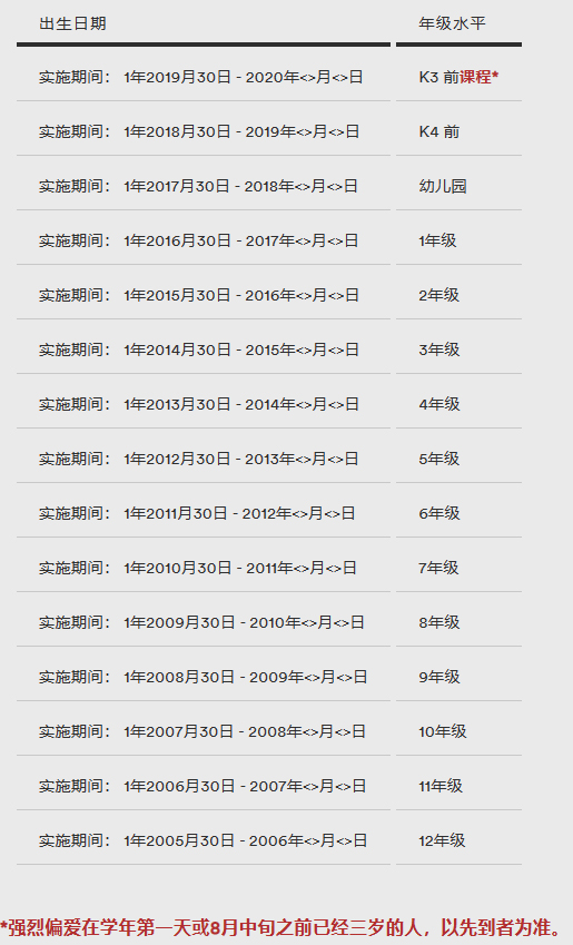 . 从具有不同校历的学校或教育系统申请的学生(如韩国、日本、新加坡或澳大利亚的学校常见的校历)如果在新学年开始时被录取,将被安排在他们目前就读的年级。如果他们在一月份被录取,他们将被安排在他们刚刚在上一所学校完成的年级。