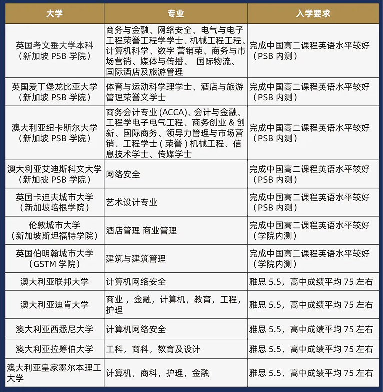 ⼊学即可获得新加坡私⽴学院的预录取通知书,学⽣在国内读完⾼中2年课程后,赴新加坡参加⽂凭课程2年,对接澳洲、英国、美国⼤学本科1年,获得本科学位;继续深造1年,可获得硕⼠学位。