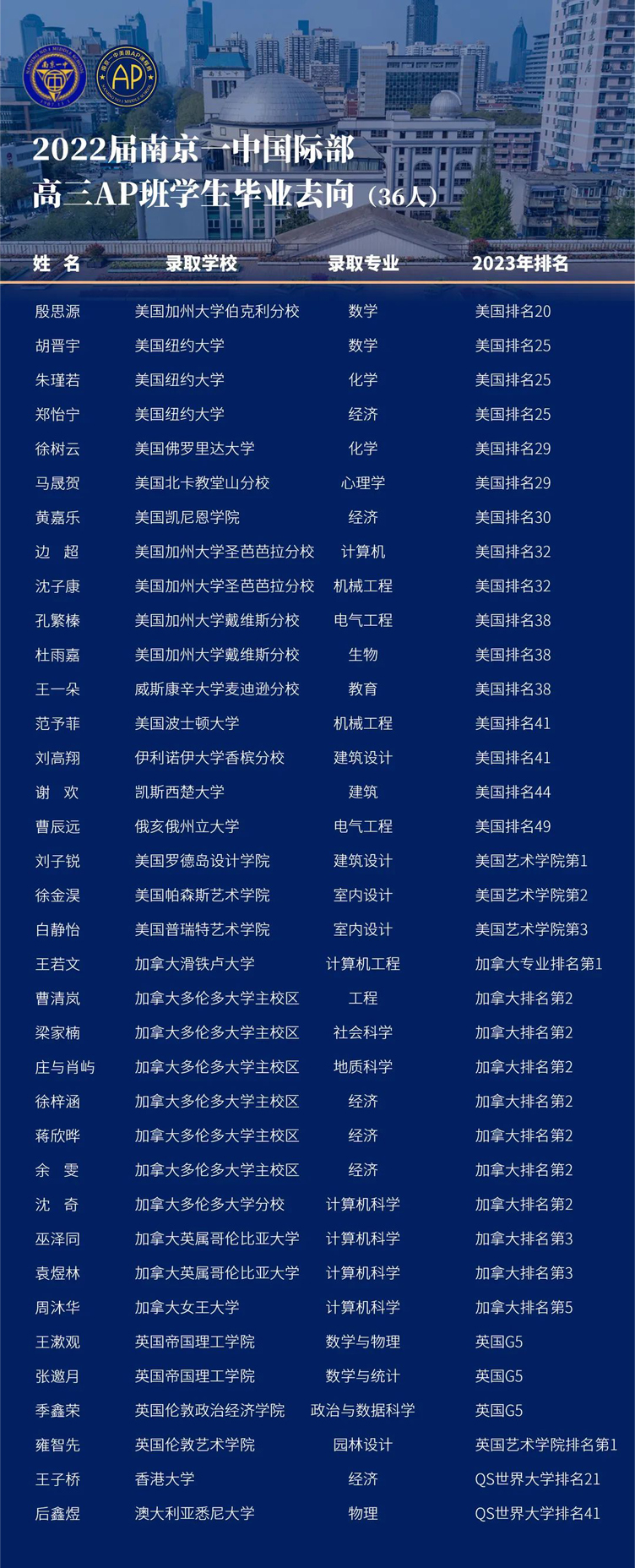 零失败。考入一中AP班就等于跨入全球名校。一中AP班9届毕业生每一个学生都是一个成功的案例,近三年更是几乎全部被美国前50,英国前10,加拿大前5以及世界排名前50的名校录取。(近三年毕业生去向见文末)