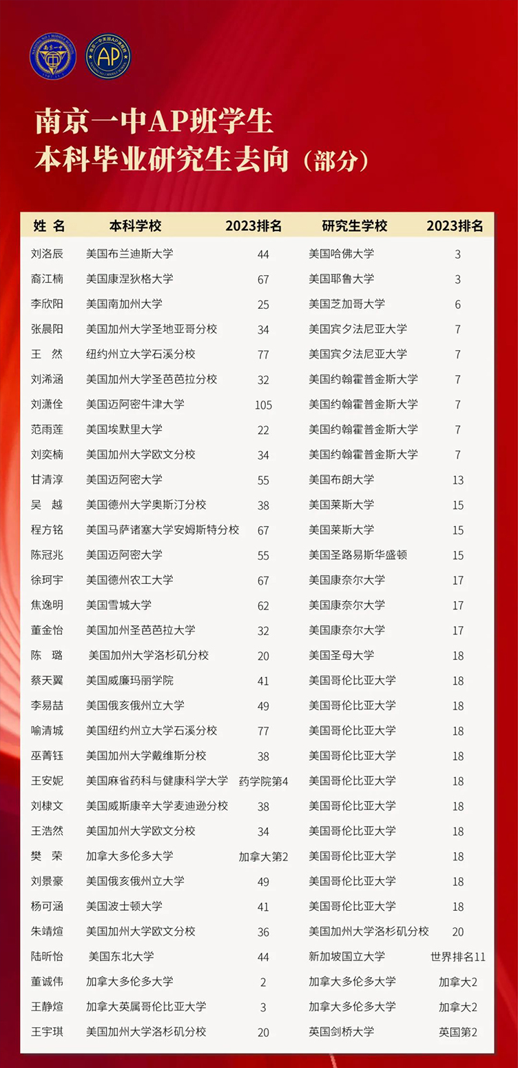 潜力大,后劲足。一中高质量全学科的AP课程为学生的高中阶段打下坚实的学科基础,不仅让学生在本科申请阶段受益,更助力他们大学后的学习。一中AP毕业的学生表现出强大的学习后劲,很多本科毕业的学生研究生阶段都升入美国排名前20的顶尖名校。(本科毕业研究生去向一览表见文末)