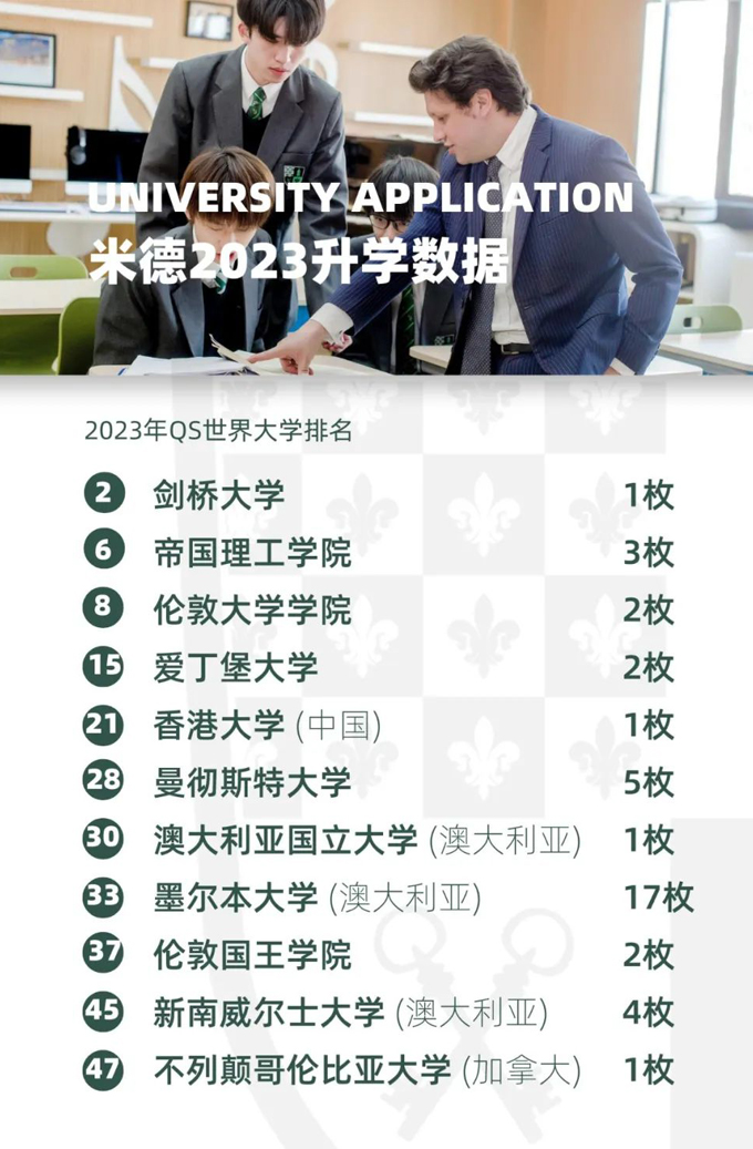 2023届米德尔顿荣光校区毕业班的全体同学均获得QS2023世界排名前50大学的录取通知。毕业生大学升学方向涵盖:美国、加拿大、英国、澳大利亚、新西兰、荷兰、香港、日本、新加坡、澳门等国家和地区。