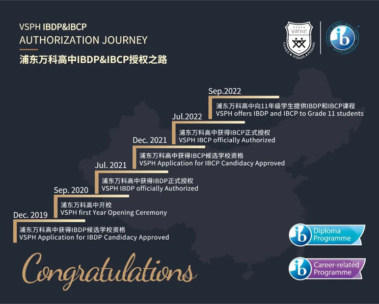 目前,上海浦东万科高中已获得教育局批准的高中办学资质和国际文凭组织(IBO)大学预科项目IBDP和职业教育项目IBCP官方的认证授权(授权代码:061355),是大陆地区第一所也是唯一一所同时开设IBDP和IBCP的非外籍人员子女学校。