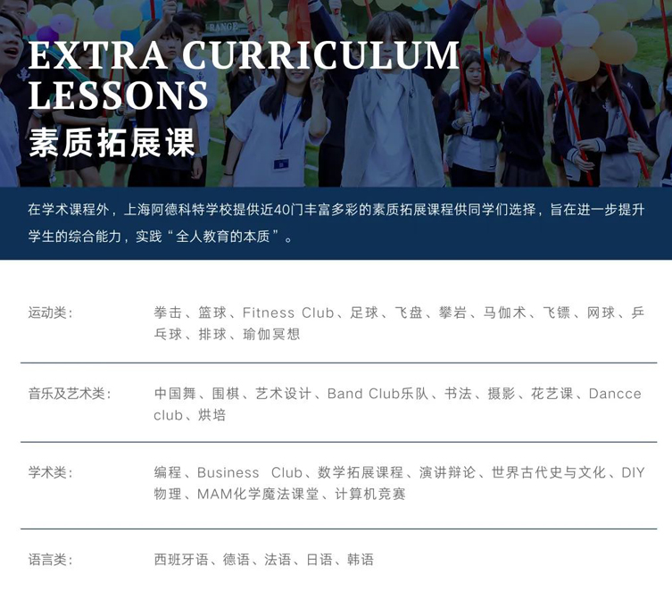 学术课程外,上海阿德科特学校提供近40门丰富多彩的素质拓展课程供同学们选择,包括四大门类:运动类、语言类、学术拓展类和音乐艺术类。旨在进一步提升学生的综合能力,实践全人教育的本质。