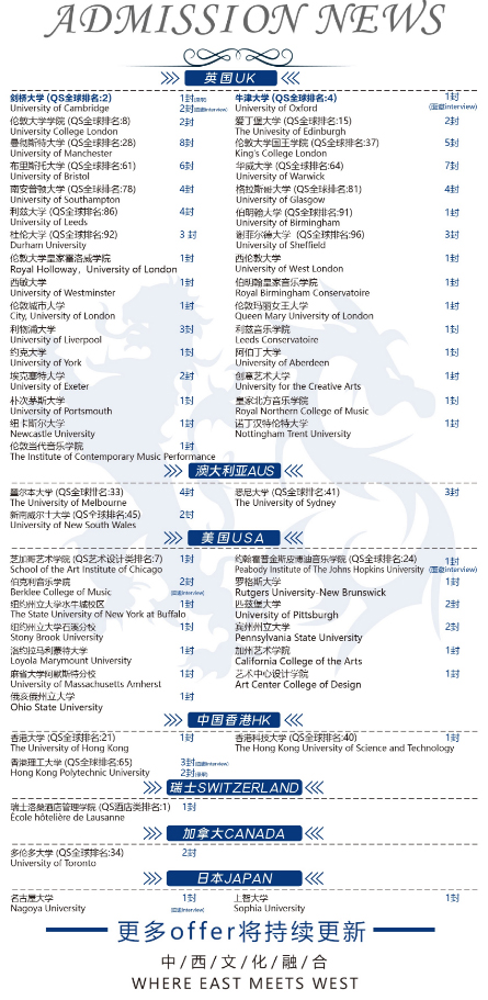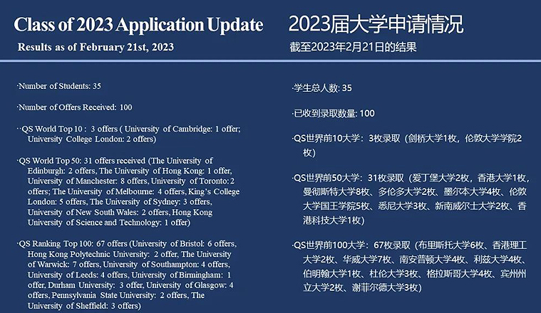 截至今日发稿,2023届35名毕业生斩获了来自英国、美国、澳大利亚、中国香港特别行政区、加拿大、日本、瑞士等国家和地区大学共计100枚录取通知书。专业覆盖了文教、数理、工程、管理、经济、音乐、艺术和设计等。这些收获充分体现了学校课程设置、办学理念和方向的专业性与正确性,也深刻体现了学校全人教育的办学理念!