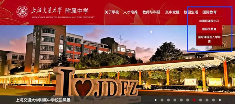 1、登录上海交大附中主页【https://fz.sjtu.edu.cn】,点击国际教育下方国际课程班入学申请按钮