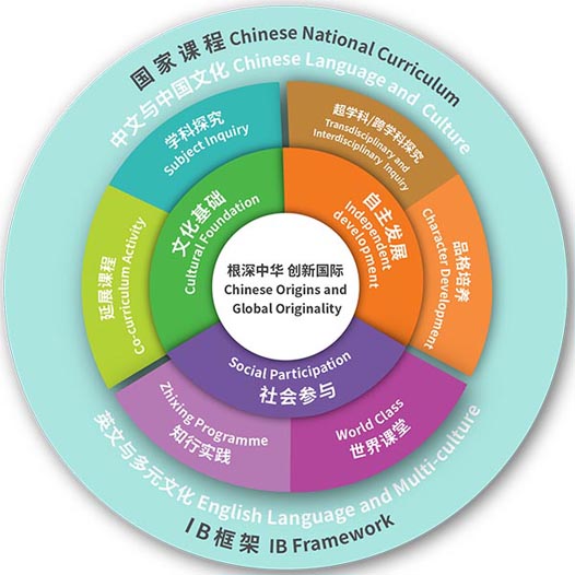 学校采用中英文双母语教育,小班教学。教育体系以中国国家课程为纲领,以创新课程为特色,培养主动进取、全面发展的终身学习者。我们将博采众长,融合中西教育最佳元素致力于开发学生创造、创新、创艺的潜质,使他们将来能与各国青年合作解决21世纪的世界性问题。