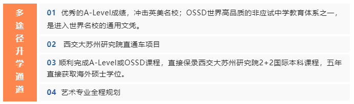 西交英澳开设国际艺术课程,为有志出国学习深造艺术和音乐的学生提供最佳升学方案。艺术生在学习A-Level课程体系的基础上,可选择专为艺术和音乐生设置的选课途径。在强化英语学习,满足国外大学申请的文化课程要求的基础上,保证学生在艺术课程的学习。个性化的作品集完成的过程中,有行业的大师领衔指导,专业的海归艺术和音乐老师团队的精心指导和教学,为录取海外优秀艺术音乐院校保驾护航。