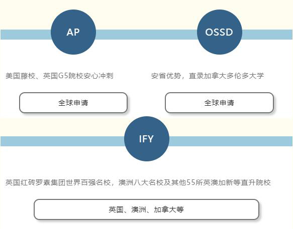 中是国内普高基础课程,通过该课程的学习,保障学生顺利完成普高必修及选修课程;西则是国际课程,国际部开设AP课程、OSSD课程和IFY课程。另外,语言拓展直接纳入课程体系,例如标化学术英语托福和雅思,以及EAP。