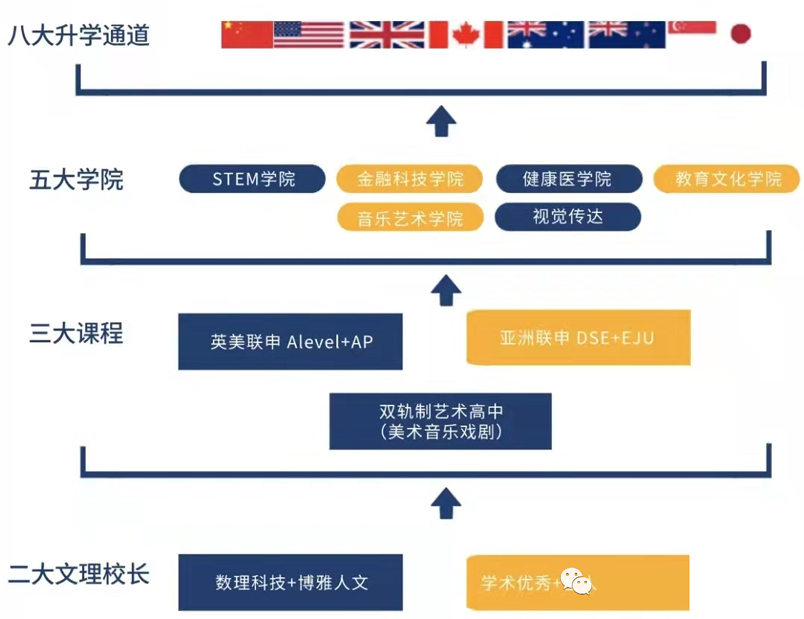 注册中外双高中学籍、获得中外高中双文凭(国家课程语文、政治、历史、地理必修),理科课程融合双语课程,国内高考与国际高考双轨制。