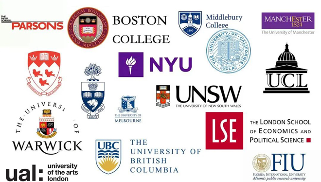 知名大学包括:U.S. News美国大学排名第21位的埃默里大学、加州大学伯克利分校、加州大学戴维斯分校;英国G5大学伦敦政治经济学院、伦敦大学学院、圣安德鲁斯大学; 加拿大多伦多大学、英属哥伦比亚大学; 澳大利亚墨尔本大学、悉尼大学;新加坡南洋理工大学、香港大学、香港理工大学;以及顶尖艺术院校伦敦艺术大学、纽约视觉艺术学院、普瑞特艺术学院等。