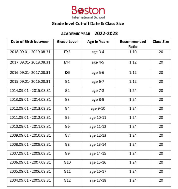 除了提供申请表和证明文件外,所有希望入学的学生都必须遵守入学标准。原则上,学生应在申请当年的9月1日之前达到表中所示的年龄。