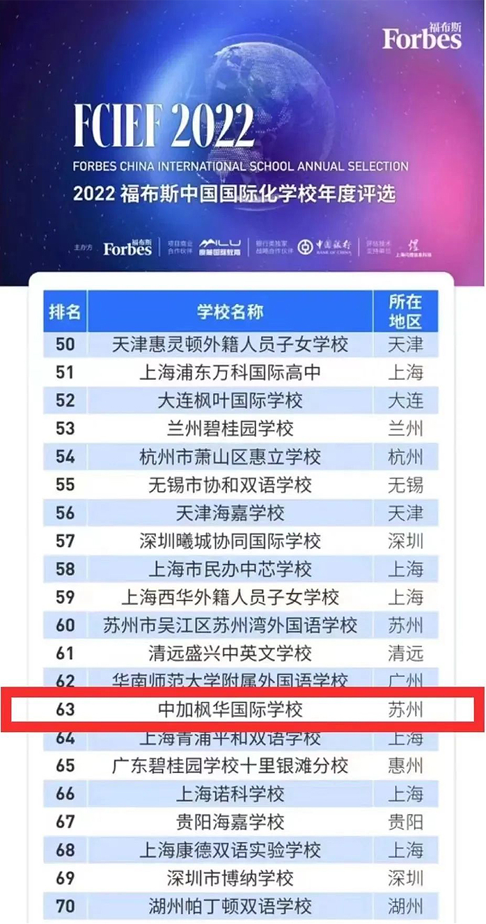 5月24日,福布斯中国正式发布2022福布斯中国国际化学校年度评选结果。中加枫华国际学校以多年的教育积累与本土影响力,荣登全国百强,位列全国第63位,江苏地区第8位。