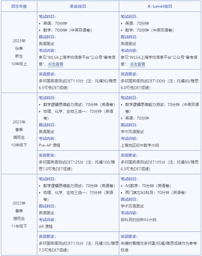 2012年9月,世界名中学联盟(World Leading Schools Association, WLSA)在上海开设了国际高中课程项目。