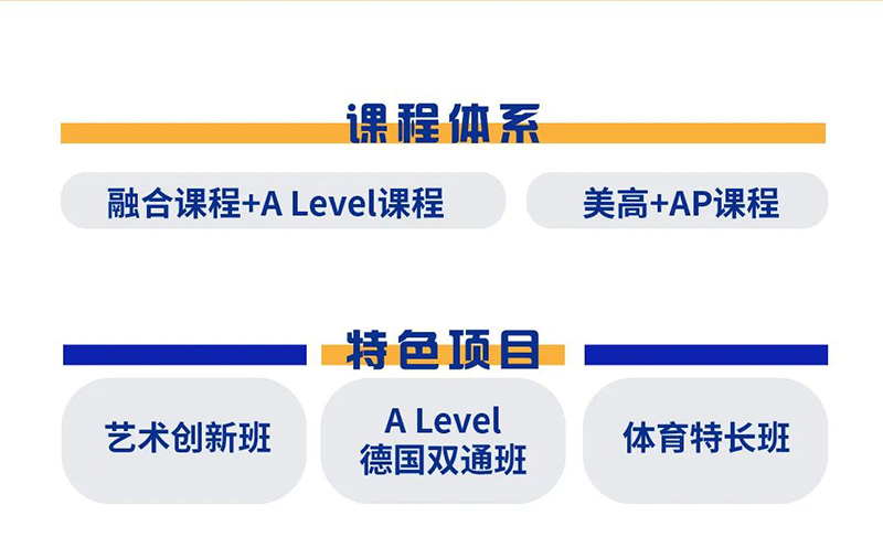 学校开设基础融合课程和A Level课程,美高+AP课程即双A国际课程,并设有艺术创新班、体育特长班、A Level德国双通班等特色项目;同时开设三大独具特色的核心拓展课程:内驱引领升学课程、自我领导力课程和元创新中心课程。