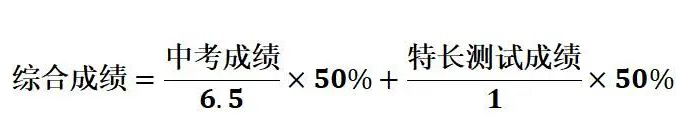特色班招生采用中考成绩占比50%,特长测试成绩占比50%的方法计算综合成绩(保留两位小数),即: