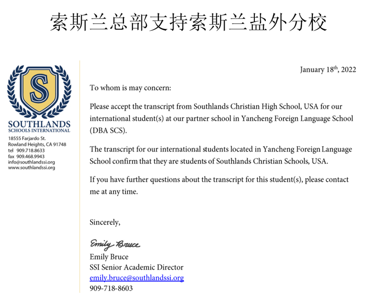 由盐城外国语学校与美国索斯兰国际学校签订合作办学协议的美国高中文凭+AP课程(美国大学理事会注册学校,AP学校注册号:694682),该课程项目严格按照盐城外国语学校的日常管理模式,整合引进美国索斯兰国际学校的权威国际教育理念和资源。采用美国标准课程体系及完善的升学指导服务,执行小班化教学,中外教师联合执教,强强联手,中西合璧,全力培养国际化人才,为学生提供美国交流学习机会,不仅提升学生的语言能力,更能提升学生自我管理与独立生活能力。