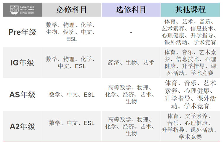 常州卡迪夫学生参加由剑桥大学考试委员会和爱德思组织IGCSE与A-LEVEL全球统考。教学围绕A-LEVEL课程展开,与中国文化、思教品德相融合,致力于培养有中国情怀和国际视野的优秀人才。常州卡迪夫开设近20门课程,注重英语教学与提升。第一年采用双语教学,第二年起以英文教学为主,采取提尖拔优、补差夯实基础的分类教学,让每个孩子都能进入理想院校。